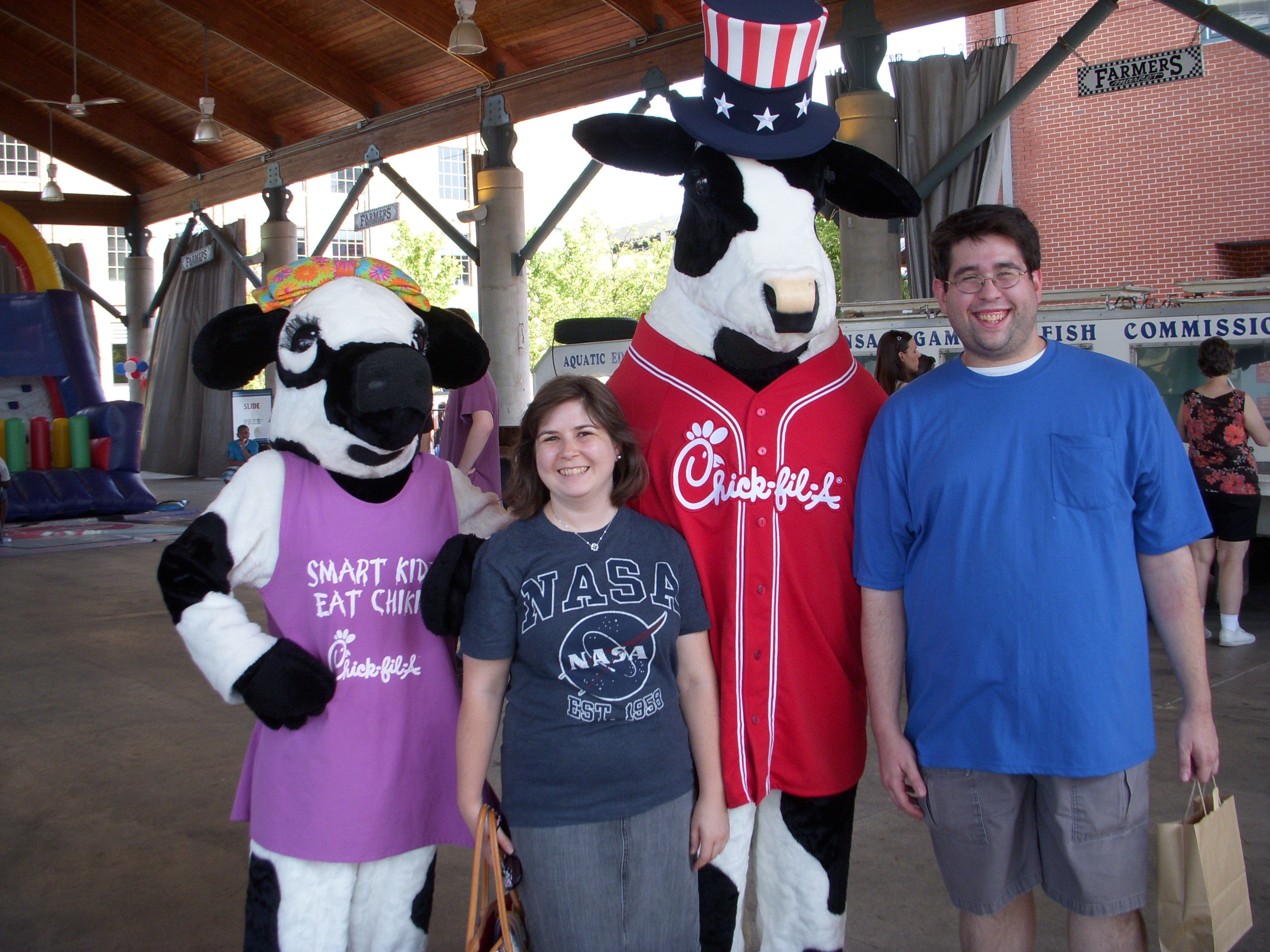 After the library we walked back to the hotel through the River Market to see the Fourth of July Festivities. they had some classic cars and a bunch of activities for kids. It was pretty empty though, which I suspect was due to the 100 degree heat! We met the Chick-fil-a cows and got to see some of the Peabody ducks up close. We were very glad we’d decided to pay for the firework viewing party so we didn’t have to sit outside in the heat!