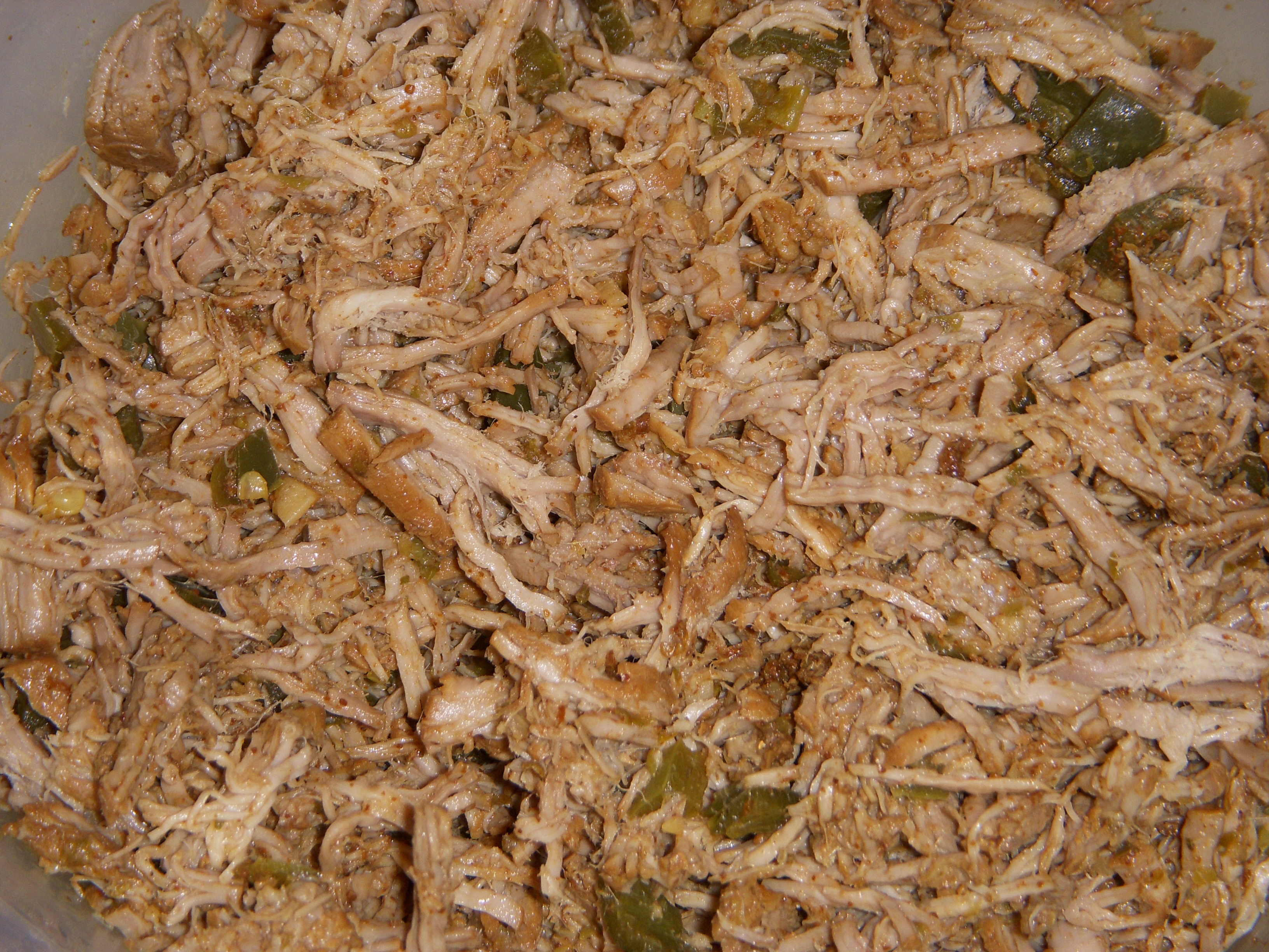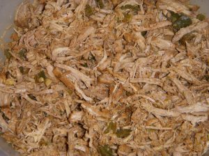 Cool meat to room temperature and shred with two forks. I think the key to great enchiladas is keeping everything very moist. I like to add a couple of spoonfuls of the reserved broth or enchilada sauce to the meat. You don’t want it swimming in sauce, but enough to moisten it.