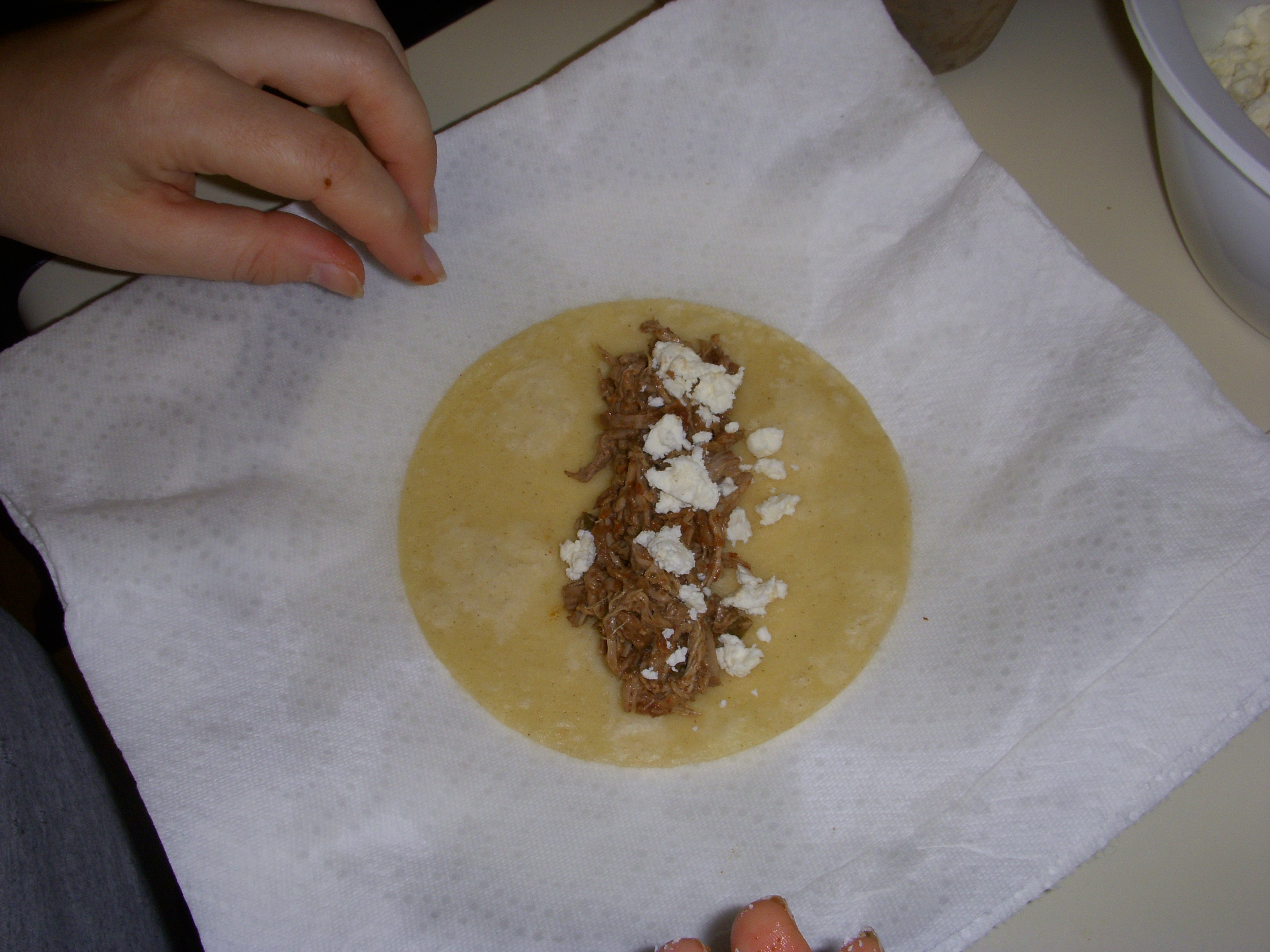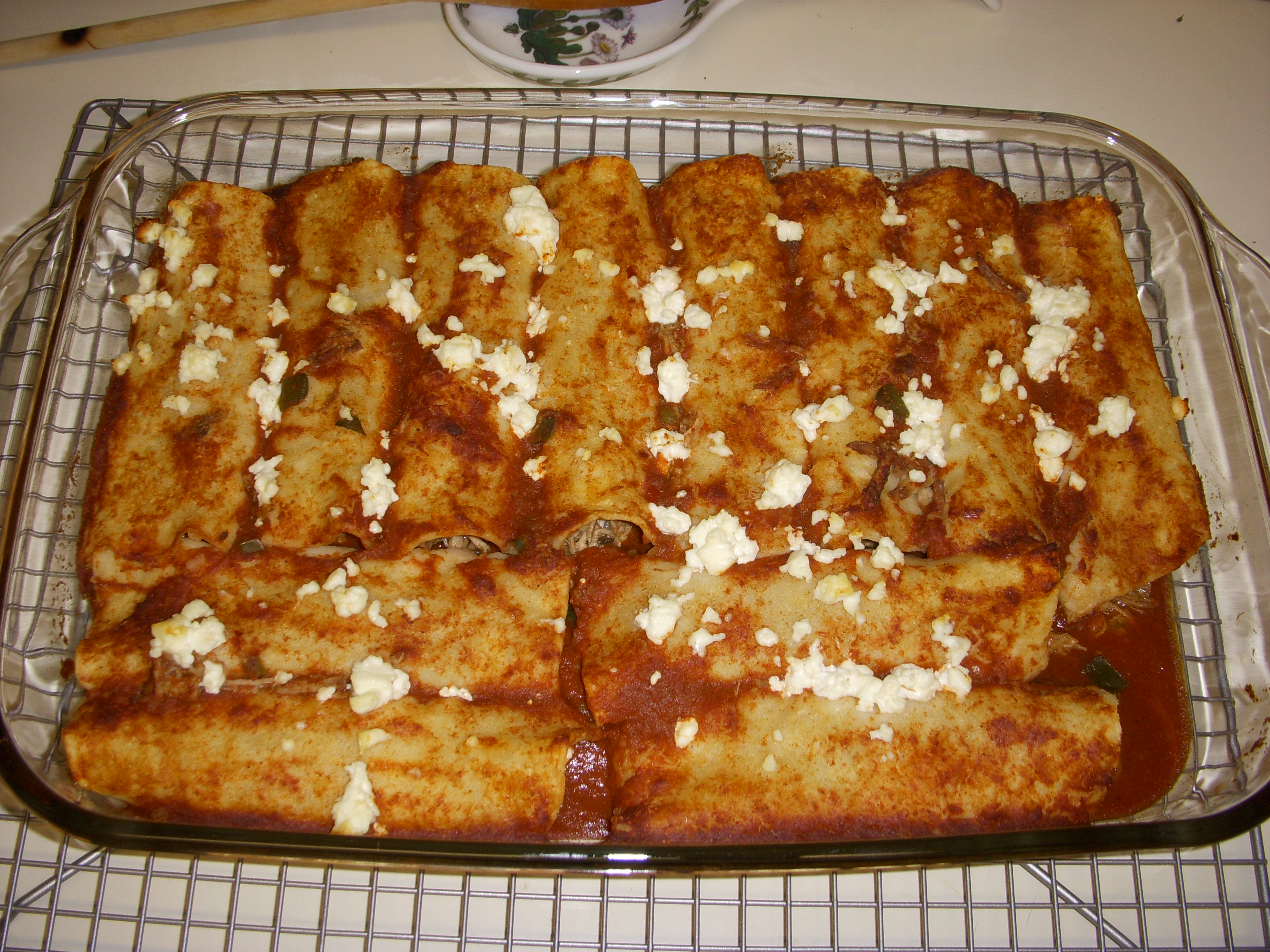 All that is left is to put some meat and cheese into the tortillas and roll them up. I use feta cheese but the enchiladas are good with just about any kind of cheese. Place the rolled tortillas into a 13×9 inch pan that has a layer of enchilada sauce on the bottom.