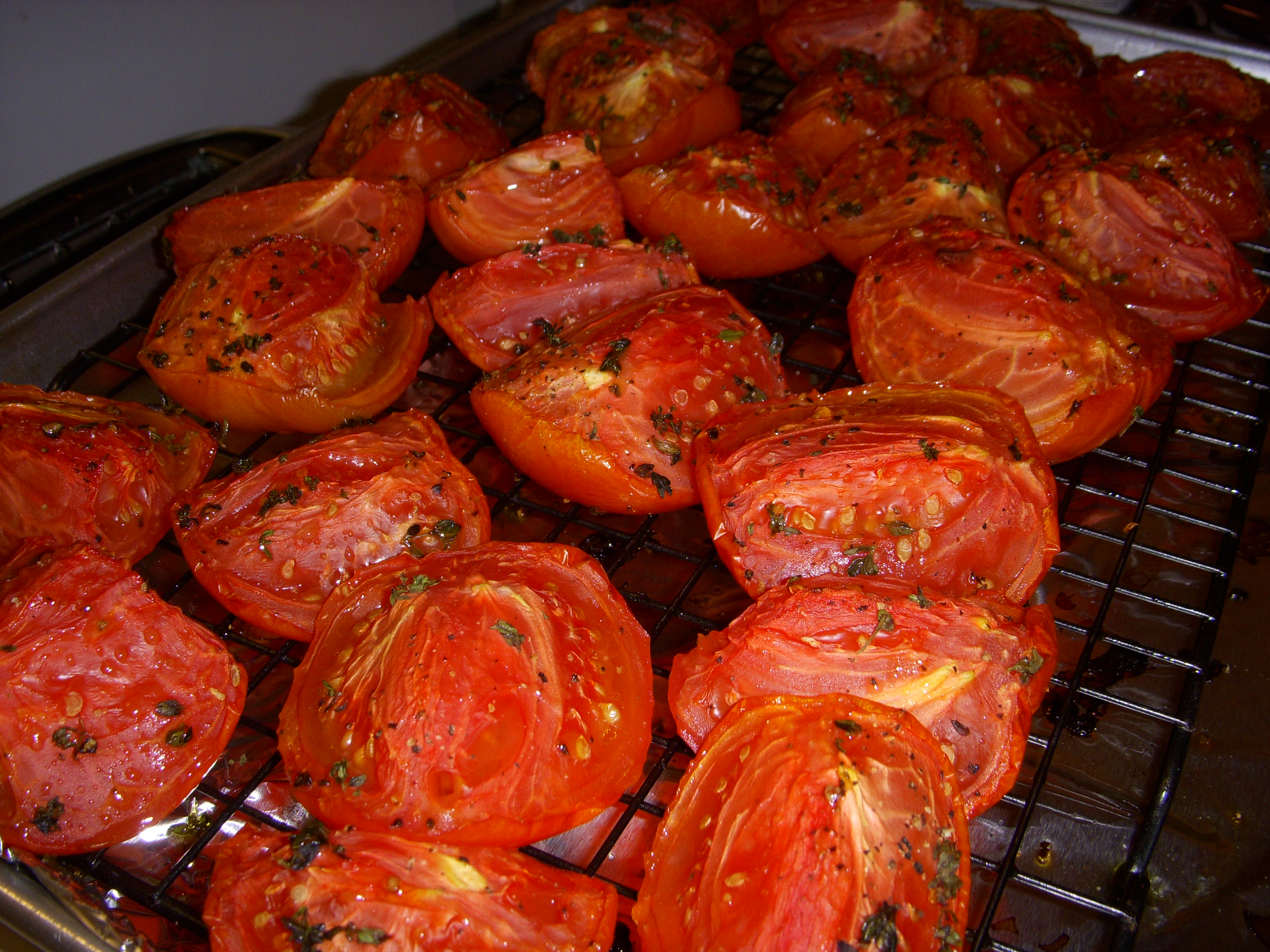 Cut the tomatoes in half or in quarters if they are very big (my Arkansas tomatoes were cut into quarters.) Place on a wire baking rack on a baking sheet. Drizzle with olive oil and sprinkle with the thyme, salt and pepper to taste. I used fresh thyme as indicated in the recipe but I wonder if using dried thyme would have been a little easier (and cheaper!) Stripping the thyme from the stems was time consuming and a little frustrating because the leaves kept sticking to my wet fingers. Next time I make the recipe I might try dried thyme and update this post with the results. Roast in a 325*F oven about 1 hour or until the tomatoes are slumped.