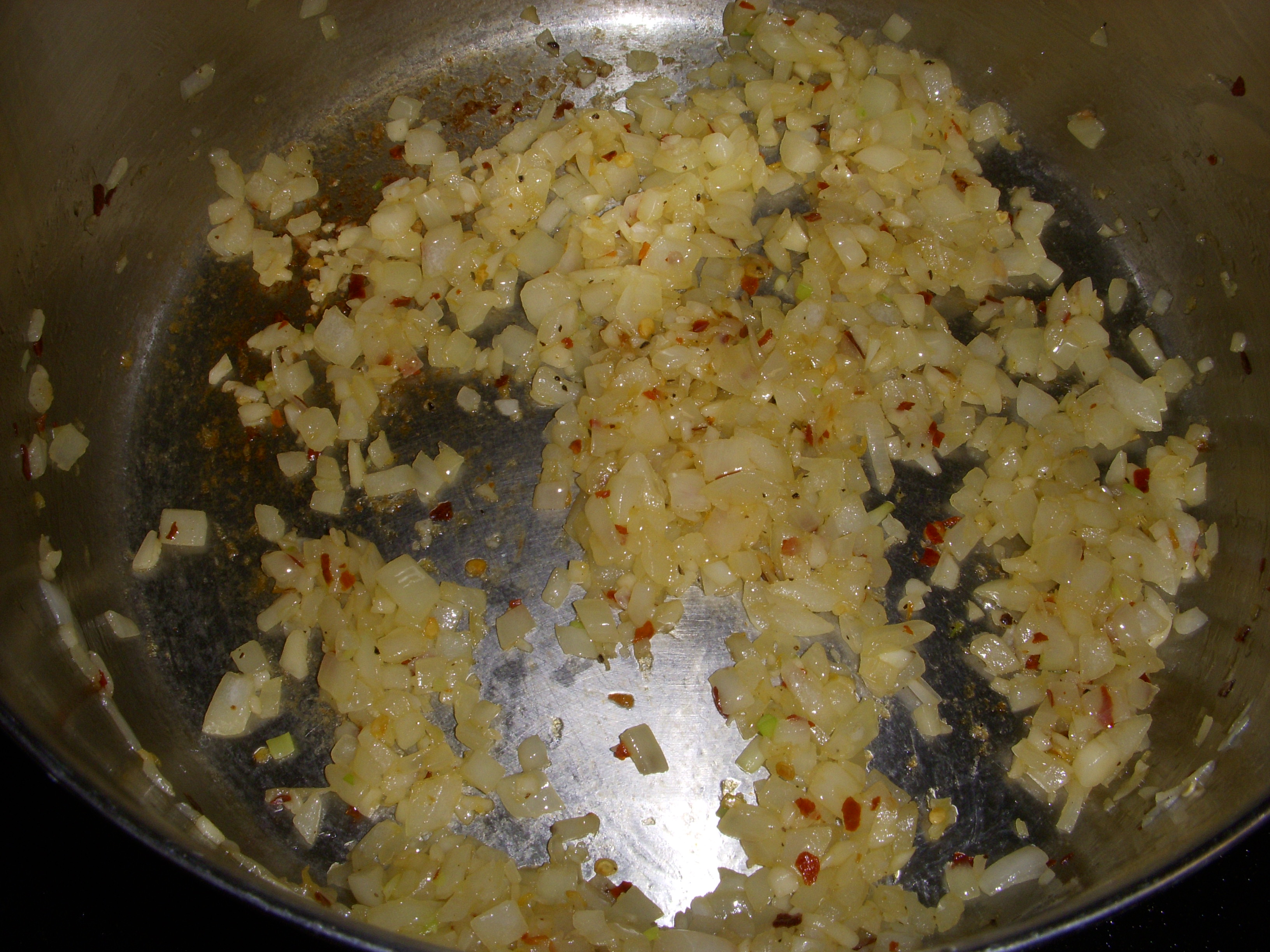 Heat the oil over medium heat. Cook onions and garlic in the oil until soft but not caramelized, 12-15 minutes. Season the onion and garlic with salt, pepper and red pepper flakes.