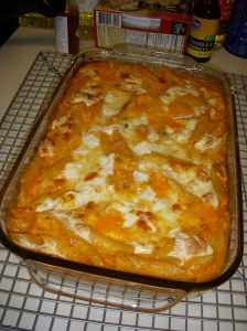 Toss the pasta with the sauce and transfer to a baking dish. Scatter the cheeses over the top of the pasta and cover with parchment and foil. This can be stored in the refrigerator or freezer until ready to bake or can be placed directly in the oven. Bake covered 45 minutes in a 375*F oven. Remove the foil and parchment and bake 20-25 minutes longer, until the cheese is browned and bubbly. (This step took a bit longer than I thought it would. Josh also complained that he didn’t wait until the cheese was browned before he declared it warm enough to eat. I think you could probably take the foil off after a half hour and let it cook an additional 30 minutes)