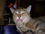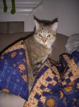 Pepper took a break from chasing pipe cleaners to give herself a bath on her floor pillow. Then she took a nap in a quilt.
