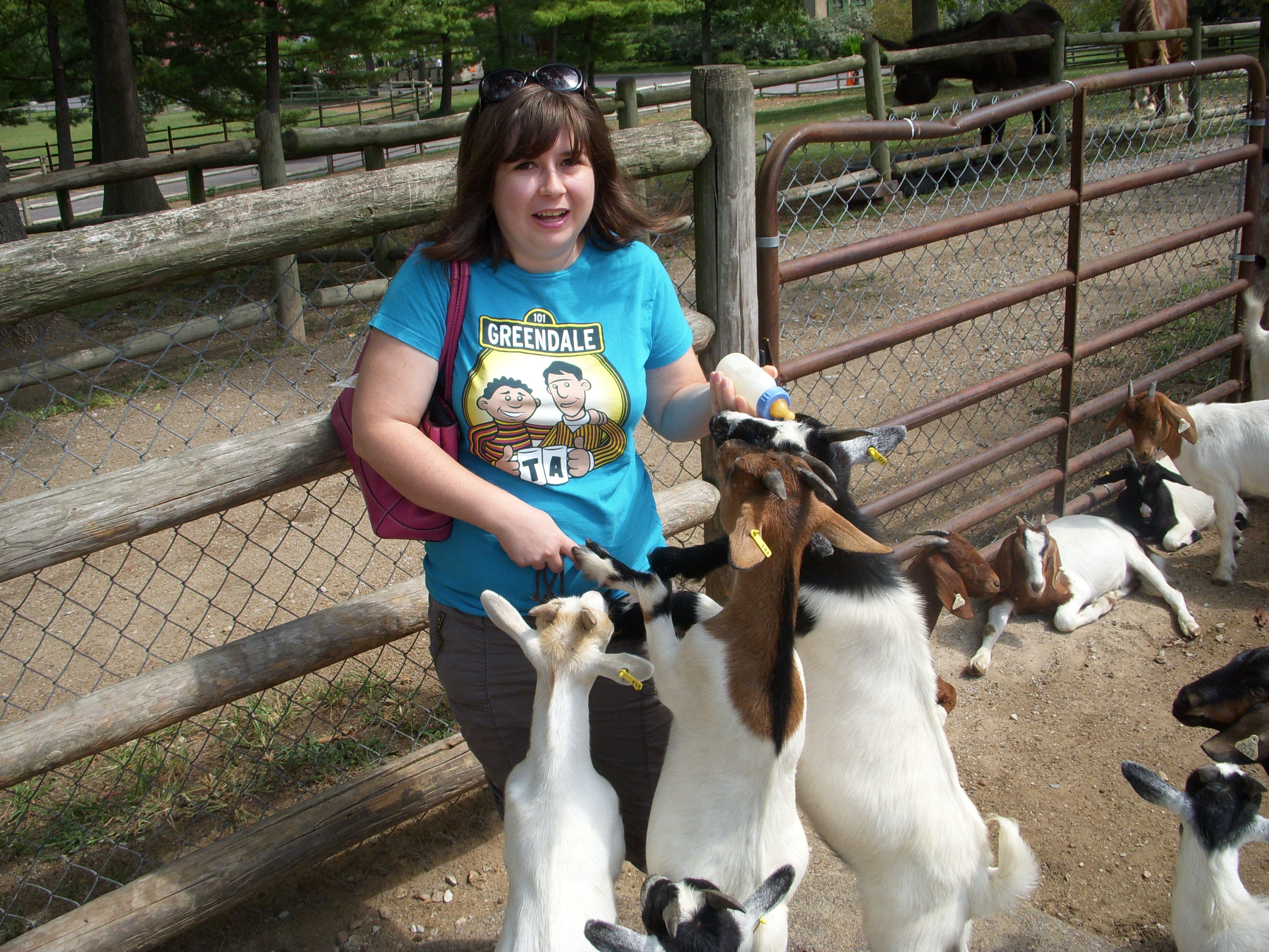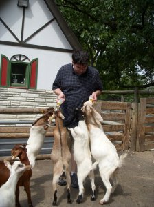 The tram takes you to a small zoo. There were two amphitheaters for animal demonstration, a carousel and a bunch of animals. The first stop was a huge pen full of goats. For $1 you can buy a bottle of milk to feed the goats. (This information explained why the value package included a slurpee and a bottle of milk. I was wondering just how many children were signing up to drink the milk!)