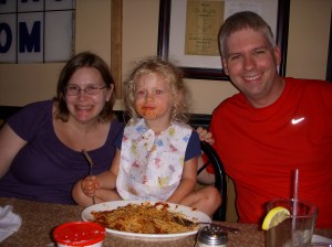 I was remember being impressed with the food and I know everyone had a very good time. Especially Tom and Sarah’s daughter, who got spaghetti sauce all over herself!