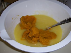 In a large bowl (the biggest one you’ve got!) mix together the sugar, oil and eggs. Add in the pumpkin and mix until well combined.