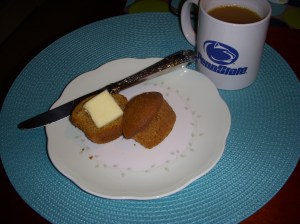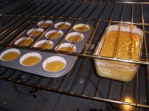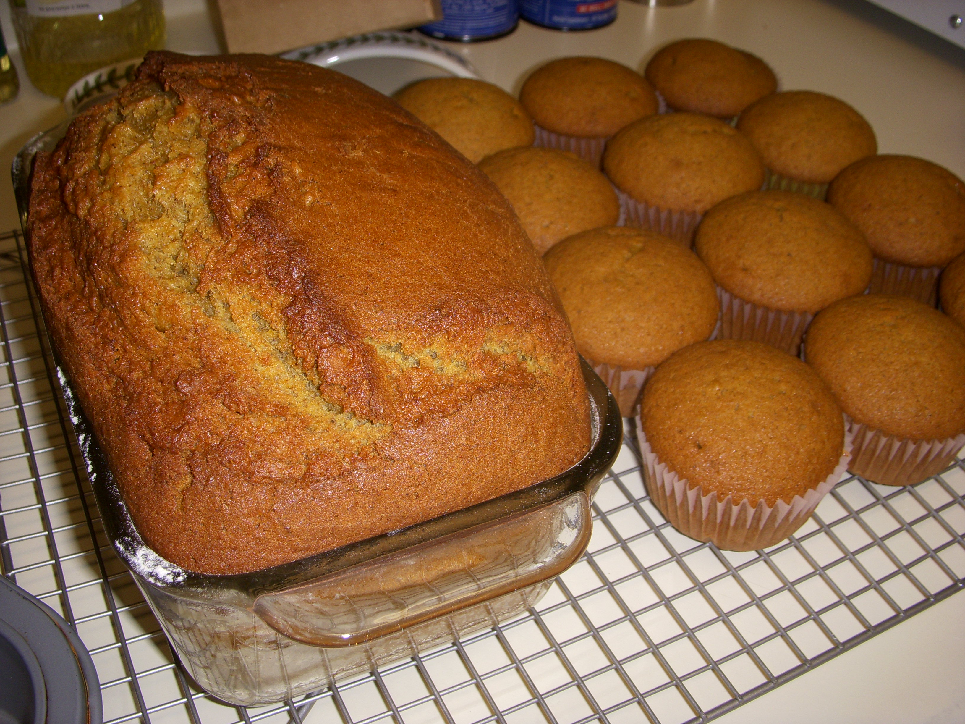 Pour into two greased and floured 9 x 5 inch loaf pans. This recipe also makes good muffins or mini loaves. On this particular day I made 12 muffins and 1 large loaf.