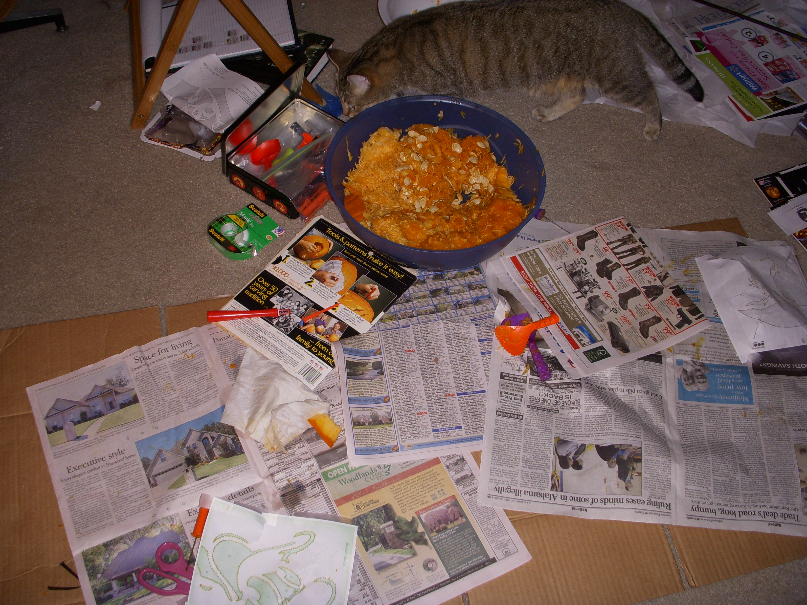One thing we have learned over the years is that in a hot, humid environment like Houston or Little Rock, you can’t carve your pumpkins early because they will quickly rot. It seemed like a waste to go to a pumpkin patch but not carve the pumpkins, so Josh and I carved our pumpkins even though it was a little early in the season. These pumpkins lasted about a week before I had to throw them away. I had a second pumpkin carving party closer to Halloween so that I could have some Jack O’ Lanterns out on Halloween night. (Not that it really matters since I don’t get any trick or treaters at my apartment.)