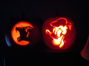 Last year in addition to the Pumpkin Masters kit I also bought a kit with Disney designs because I thought Josh would like to try the Donald Duck design. This was Josh’s first time using the Pumpkin Masters approach and the Donald design was more challenging than we thought it would be. He had a hard time with some of the thin lines (especially around the eyes) but his pumpkin still looked good when we lit it.