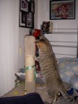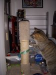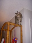 Anyway, on to the pictures! Josh requested a series of pictures about the treat game he plays with Pepper. Josh “hides” treats on the top of Pepper’s favorite wicker cat tree shelving unit. We also hide them on the top of her scratching post and at a couple of other locations around the room. Pepper then runs around trying to find them. She is getting pretty good at knocking them off of the wicker cat tree and catching them in mid-air. I have included a couple of old pictures of her walking around the top of the shelving unit.