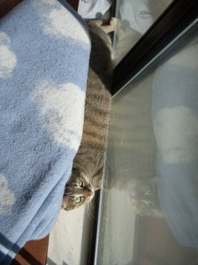 Anyway, here are some pictures of Pepper in one of her favorite sleeping spots. I knew this would be a popular spot for catnaps because it gets a lot of sun.