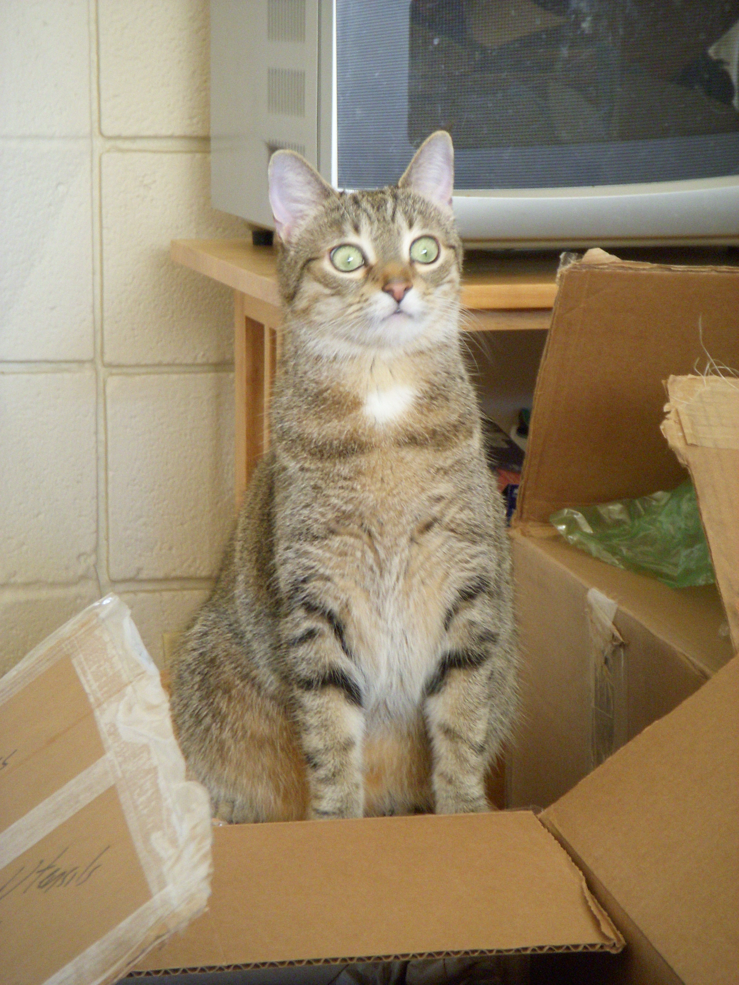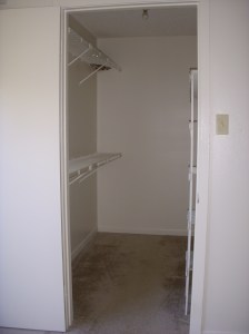 I finally got her to come down by offering some treats and I grabbed her. I put her into the carrier and went to the office to get the office manager to do the walk through of the apartment. I told her the story as we walked through the apartment and when we got to the bedroom closet she looked up and said, “There’s the cat!” Some how she had escaped the carrier and gotten back into the closet! You can’t fool a cat twice, so we ended up having to trap her.
