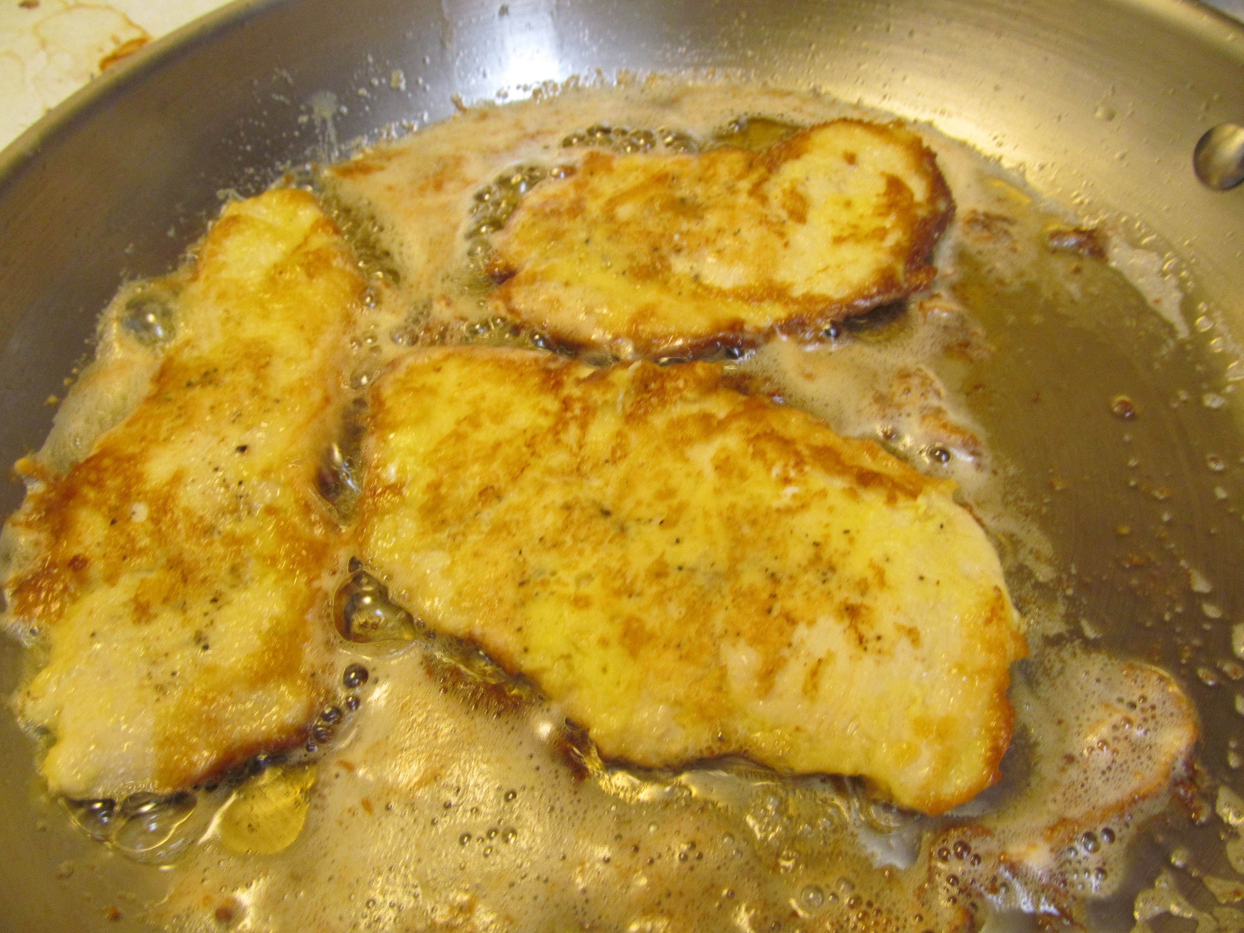 Heat the oil in a pan over medium to medium-high heat. Dredge the chicken in the flour mixture and then in the egg mixture. Place the coated chicken into the pan. Cook 2-3 min each side, until a deep golden brown.