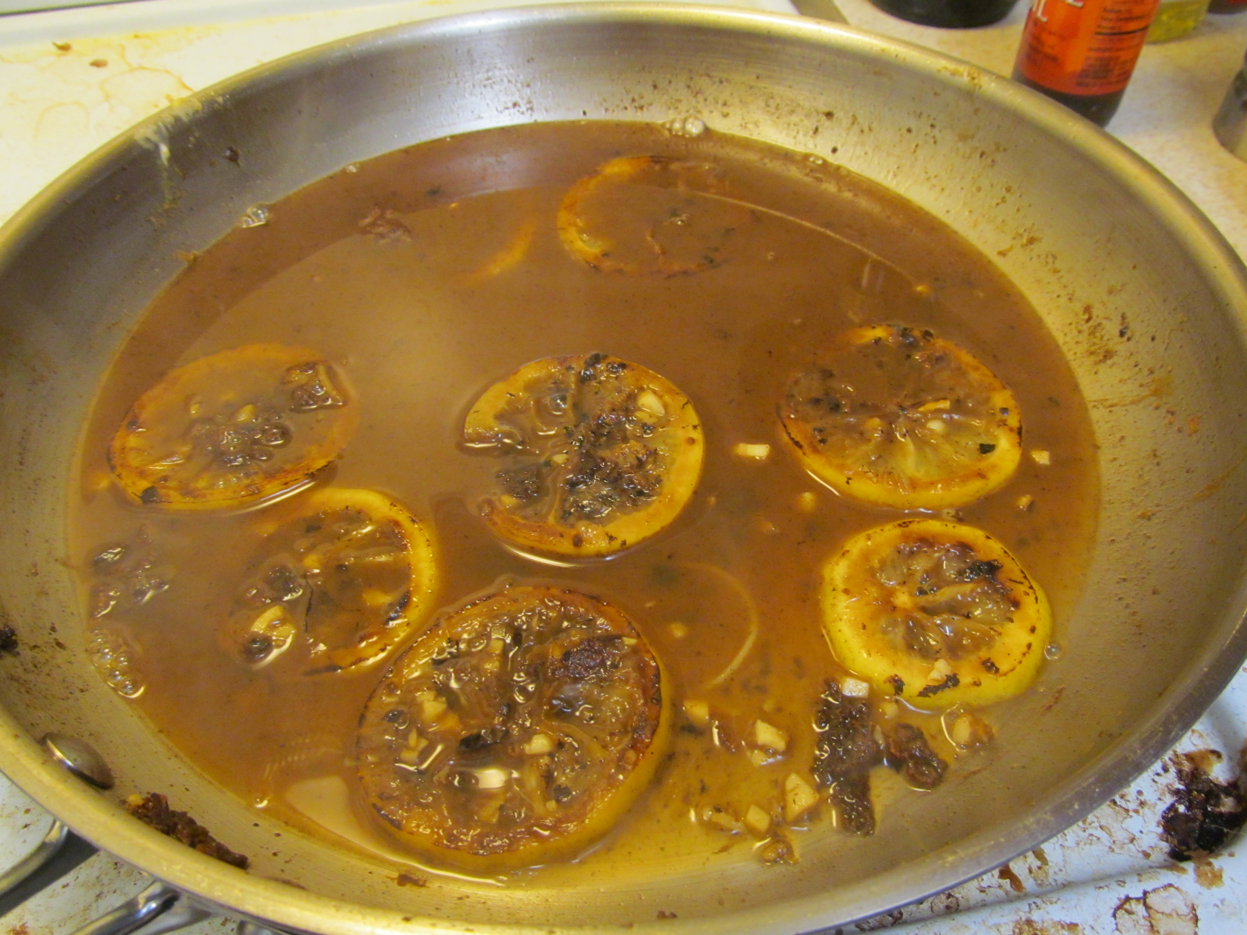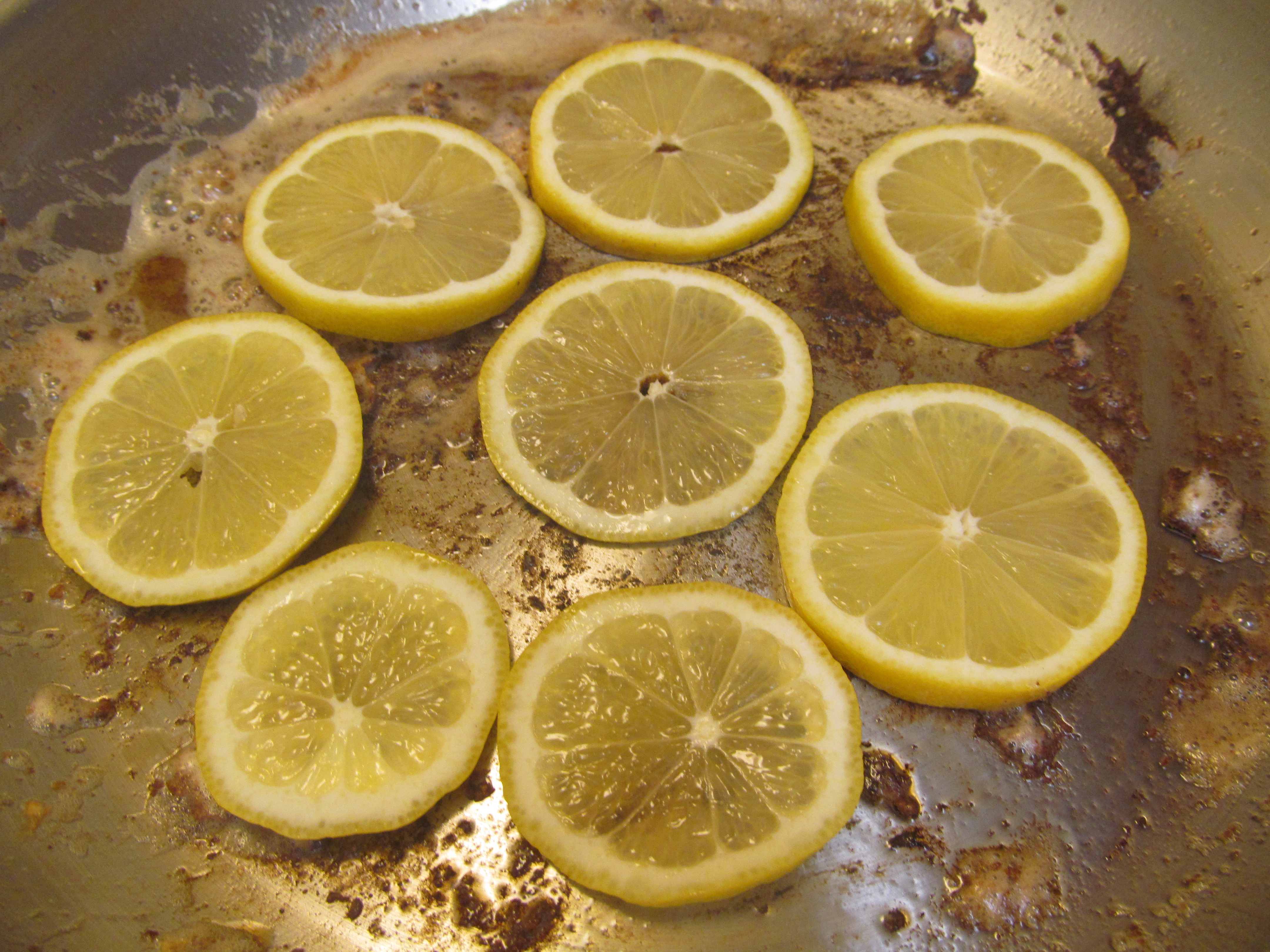 When all of the chicken is cooked place the lemon slices in the pan and caramelize.